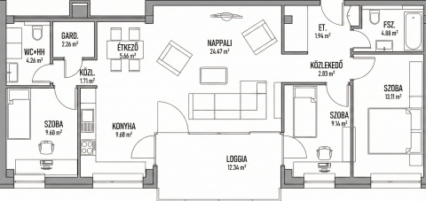 A lakás egyik legnagyobb értéke a korszerű fan-coil hűtés-fűtés rendszer, amely a padlófűtéssel kombinálva prémium komfortot biztosít: