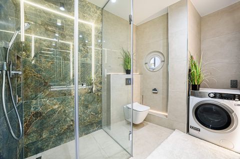 Minőség: Prémium anyaghasználat, válogatott burkolatok és modern, letisztult esztétika jellemzi az egész ingatlant.
