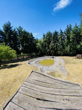 A 1450 m²-es, rendezett telek széles utcafronttal rendelkezik, amelyet fenyőfák tesznek igazán hangulatossá. Az ingatlan egyik kiemelkedő eleme a közel 100 m²-es, 2 méter mély kerti tó, amely ritkaságnak számít a környéken, és egyedi karaktert ad a területnek.
